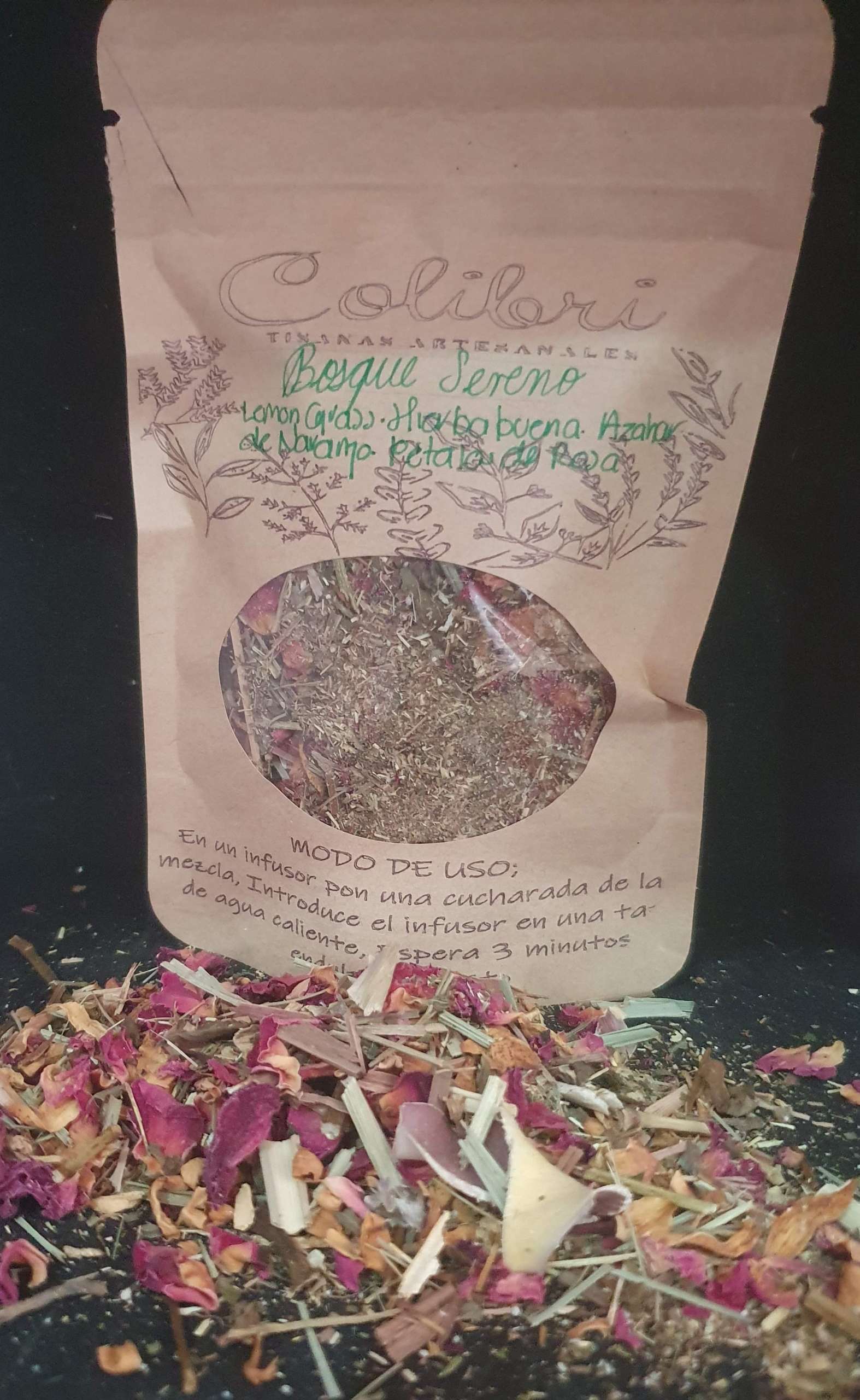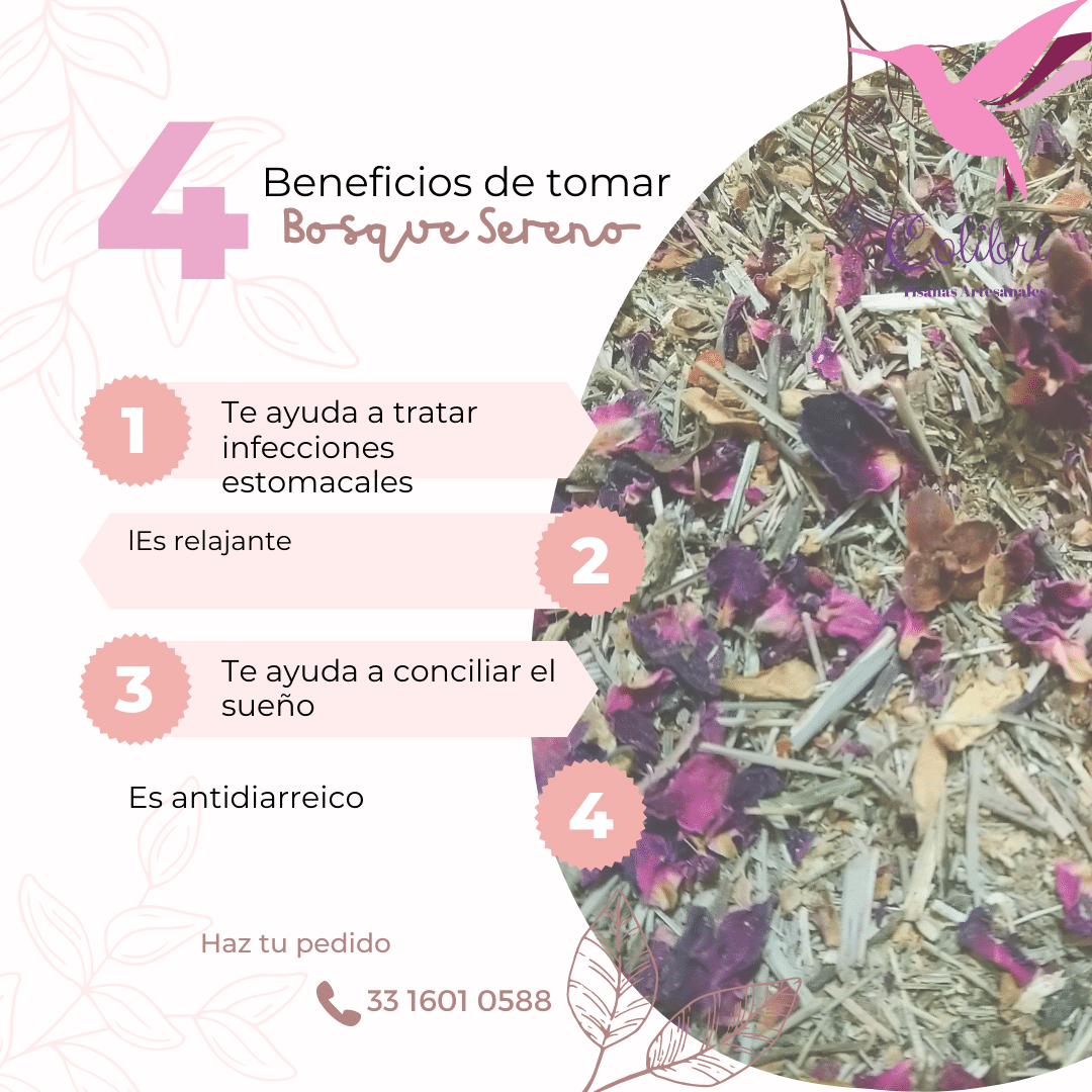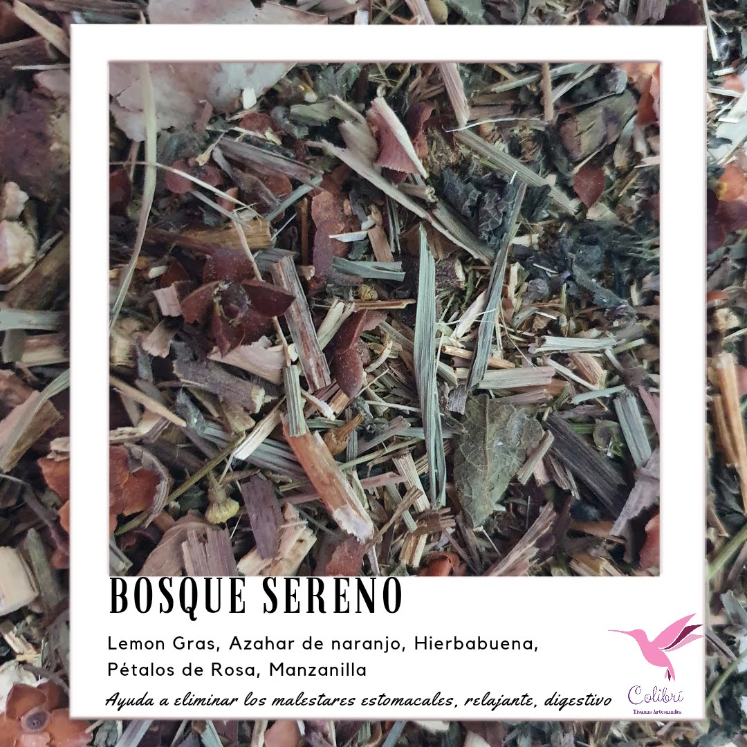 Bosque sereno es una mezcla herbal que entre sus ingredientes tiene hierbabuena, azahar de naranjo, té de limón, pétalos de rosa y manzanilla. Es una mezcla ideal para tomar después de comer o antes de dormir.