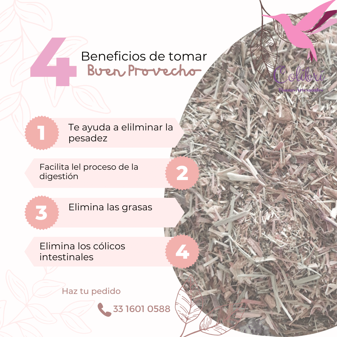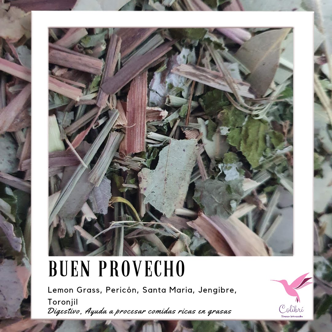 Buen provecho es una mezcla herbal ideal para disfrutar después de una comida rica en grasas. Es una deliciosa mezcla de Té de lmón, pericón, Hierba Luisa y manzanilla. Se recomienda disfrtuar esta mezcla después de comer y tomarla como infusión caliente, pero también es delciosa para disfrtuarla como té helado.