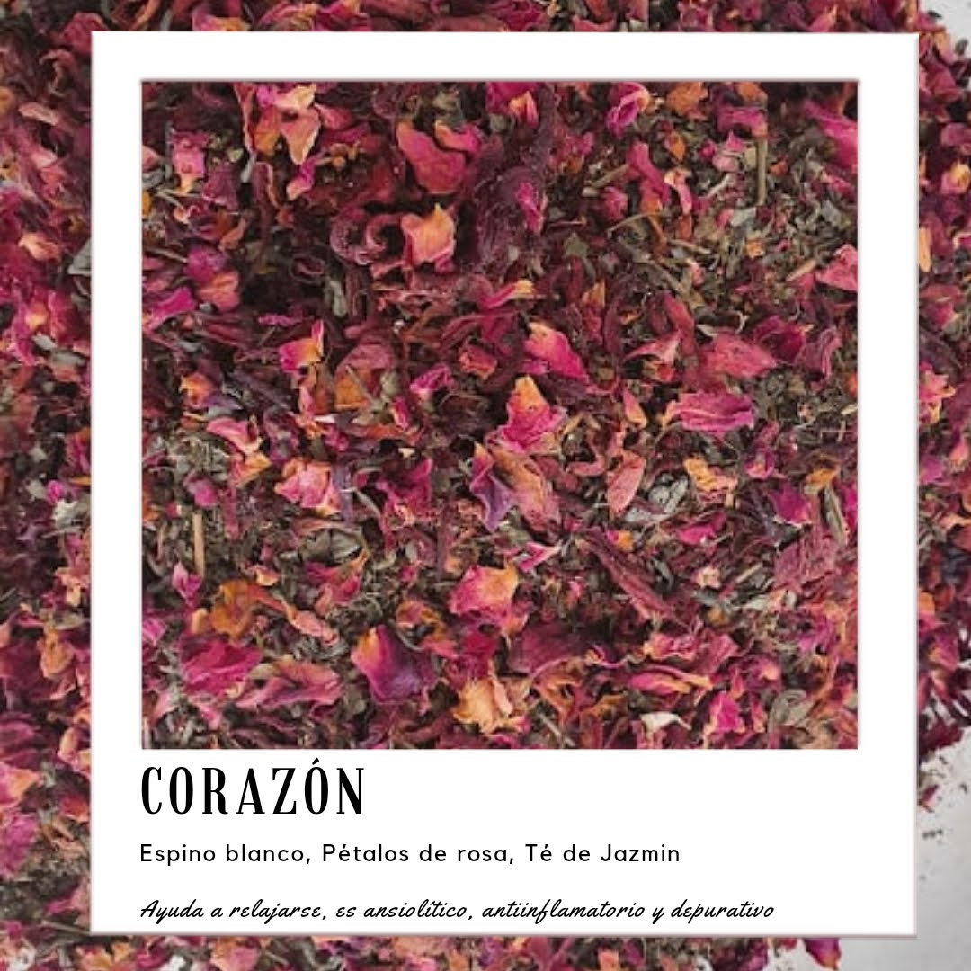 Corazón es una combinación de Espino blanco, Petálos de rosa y Té de Jazmin. Se puede tomar a cualquier hora del día y se recomienda tomar como infusión caliente. Esta es una arómatica tisana, con el delicioso olor del te de jazmin, el dulce de los pétalos de rosa y el poderoso antinflamatorio del espino blanco.