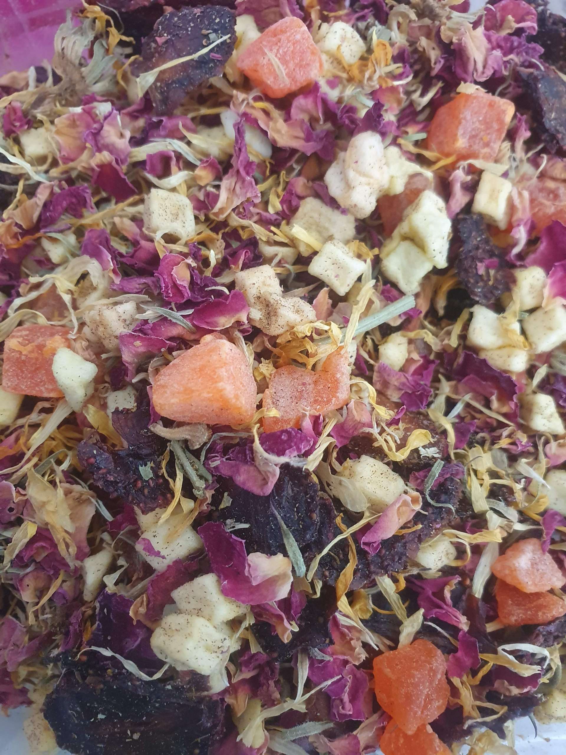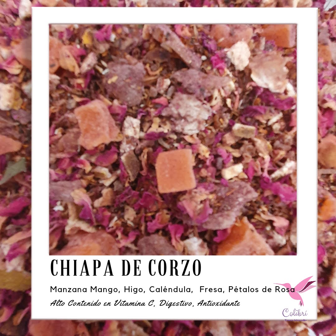 Chiapa de Corzo es una colorida mezcla de Flor de caléndula, manzana, mango e higo. Es ideal para tomar a cualquier hora del dia o para después de comer. Se puede tomar fria o caliente.