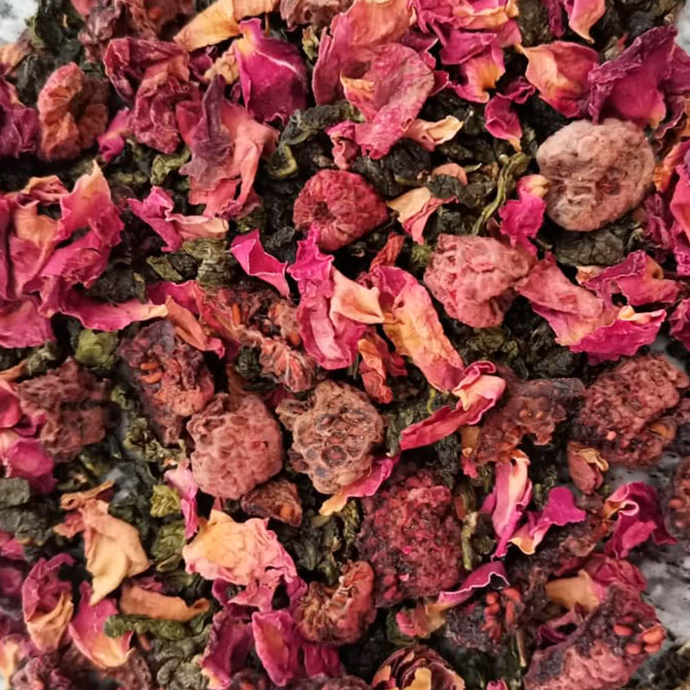 Esta es una deliciosa combinaciòn de Frambuesa, Pètalos de rosa y Tè Oolong. ES una mezcla que te cautivara por su apariencia, su olor y sobre todo su sabor.