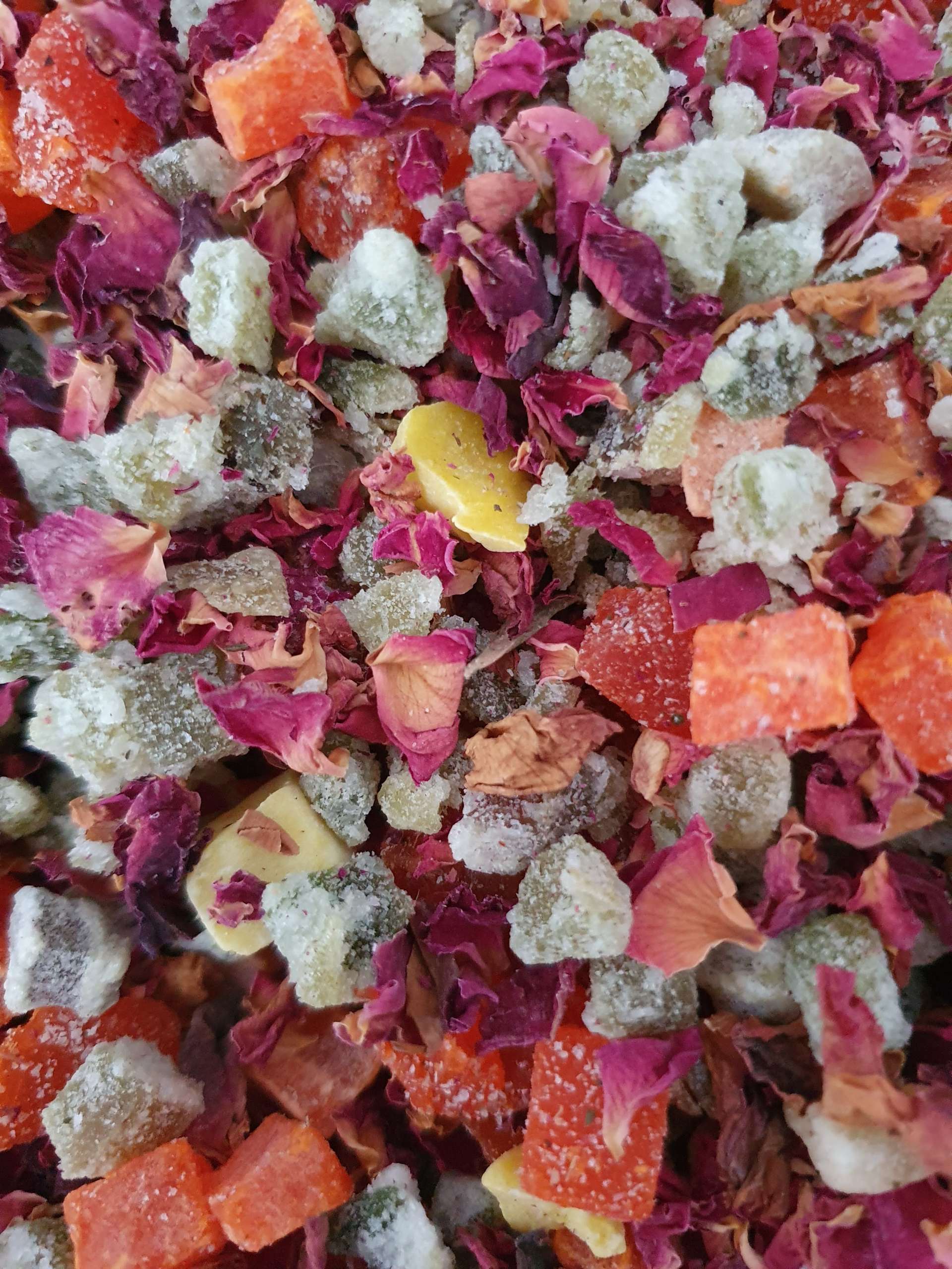 Combinaciòn de tè verde, pètalos de rosa, mango, manzana, fresa y kiwi. Esta mezcla tambièn la puedes tomar como tè helado, como infusiòn caliente y como frappè.